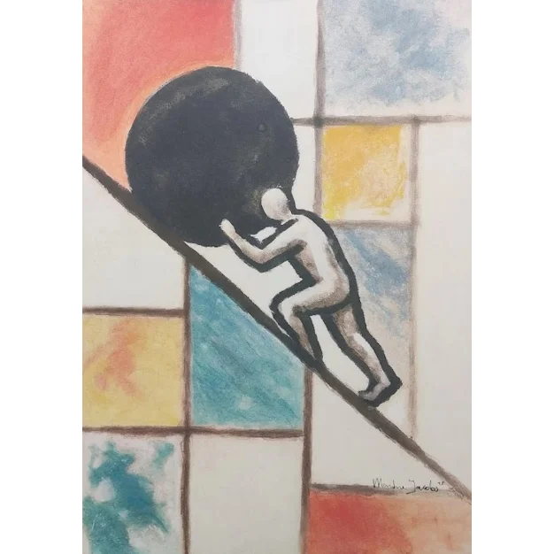 With this pastel work, I wanted to not only depict the myth of Sisyphus but also evoke a universal sense of human struggle and perseverance. The figure is anonymous and stylized because he can be anyone: you, me, any person struggling with their own 'boulder'.