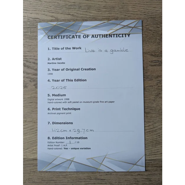 From 'Lonely Buddha', which presents stillness as endurance, to 'Life Is a Gamble', where a contemplative female figure and ancient scripts converge to express uncertainty as a lived condition, this collection captures the risks women navigate within technological and cultural systems. Originally rendered on a Pentium II, these digital artifacts are now preserved on-chain, bridging the gap between 20th-century digital pioneering and the future of provenance."