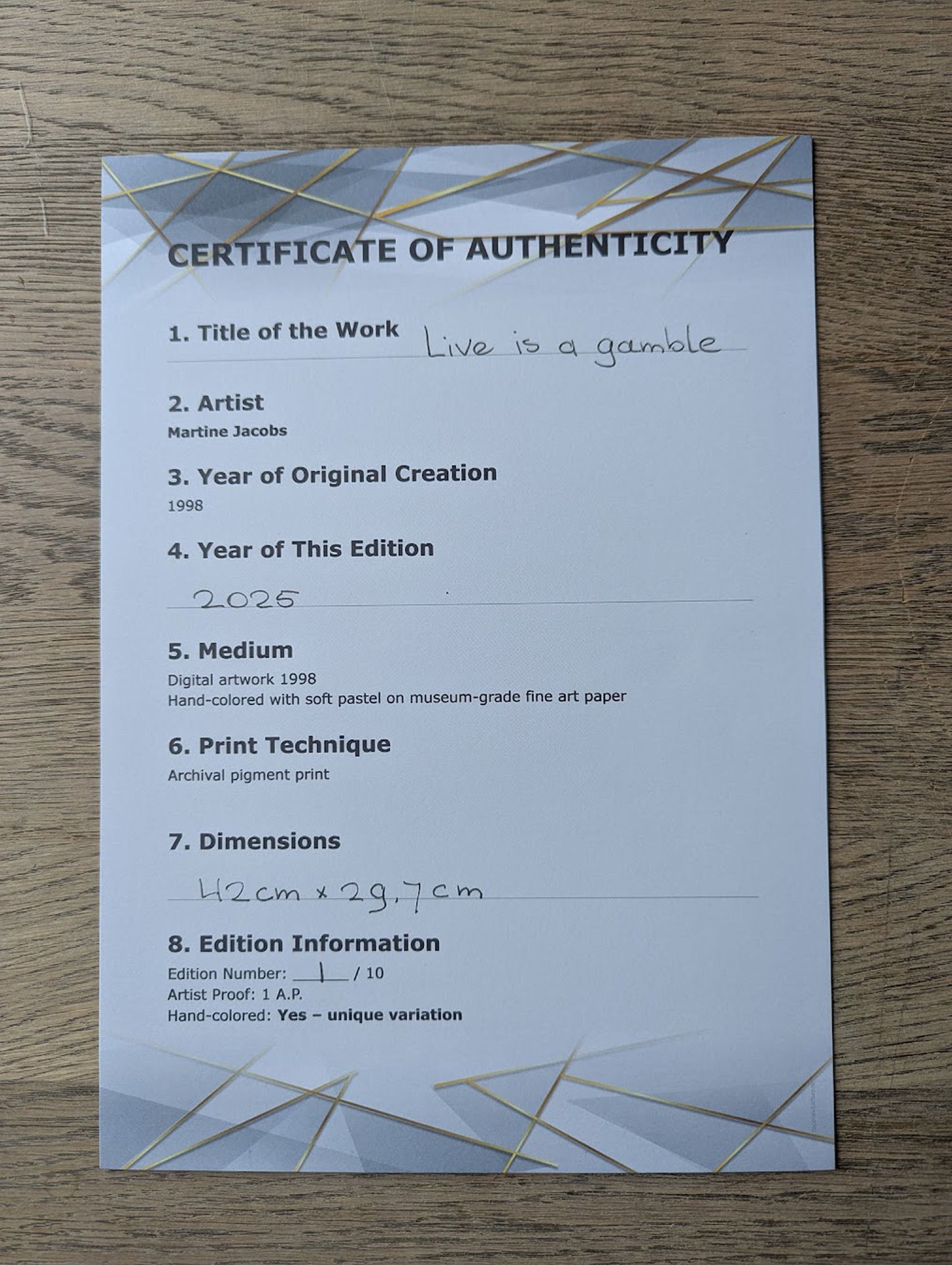 From 'Lonely Buddha', which presents stillness as endurance, to 'Life Is a Gamble', where a contemplative female figure and ancient scripts converge to express uncertainty as a lived condition, this collection captures the risks women navigate within technological and cultural systems. Originally rendered on a Pentium II, these digital artifacts are now preserved on-chain, bridging the gap between 20th-century digital pioneering and the future of provenance."