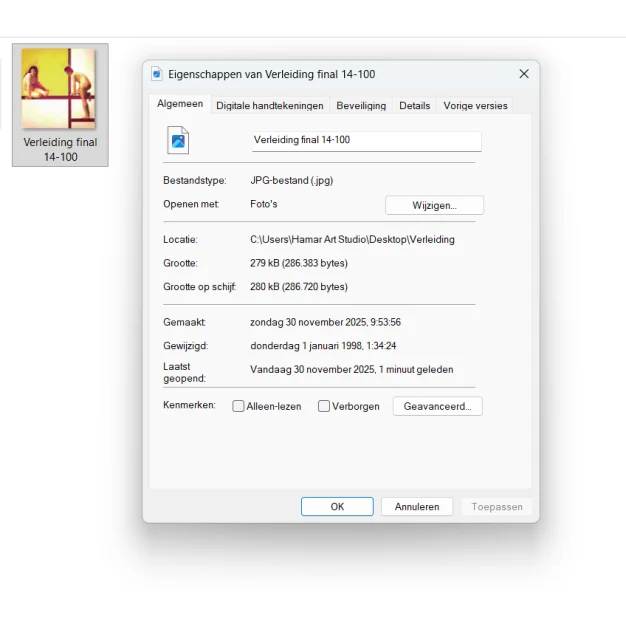 Verleiding is a striking digital composition created by Martine Jacobs in 1998 — a time when digital art was still emerging from its infancy. Using early-generation software and hardware, Martine crafted a sensual tableau of two nude women suspended within a rigid Mondrian-inspired frame. The figures, rendered with emotional realism, appear both exposed and contained — their bodies caught between desire and structure, softness and grid.