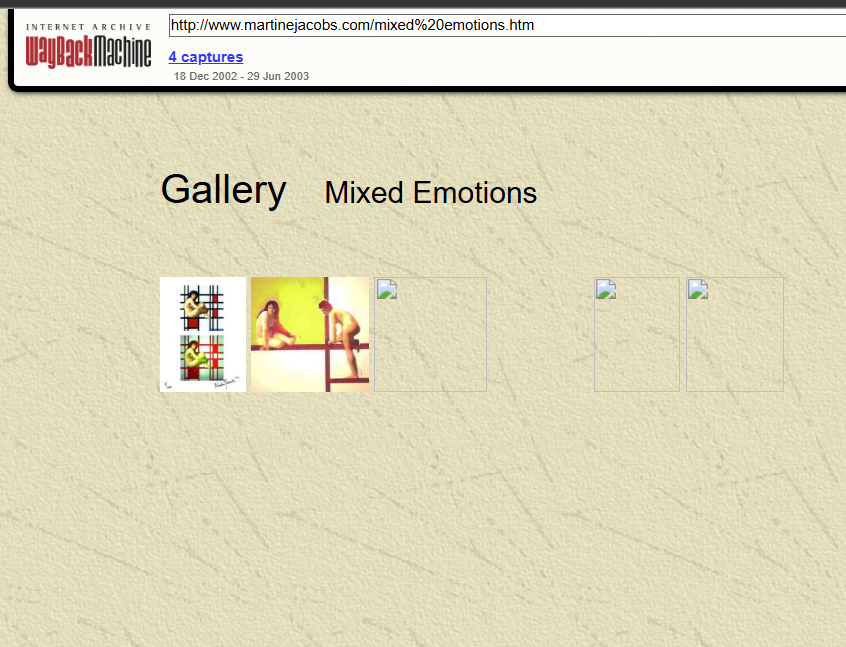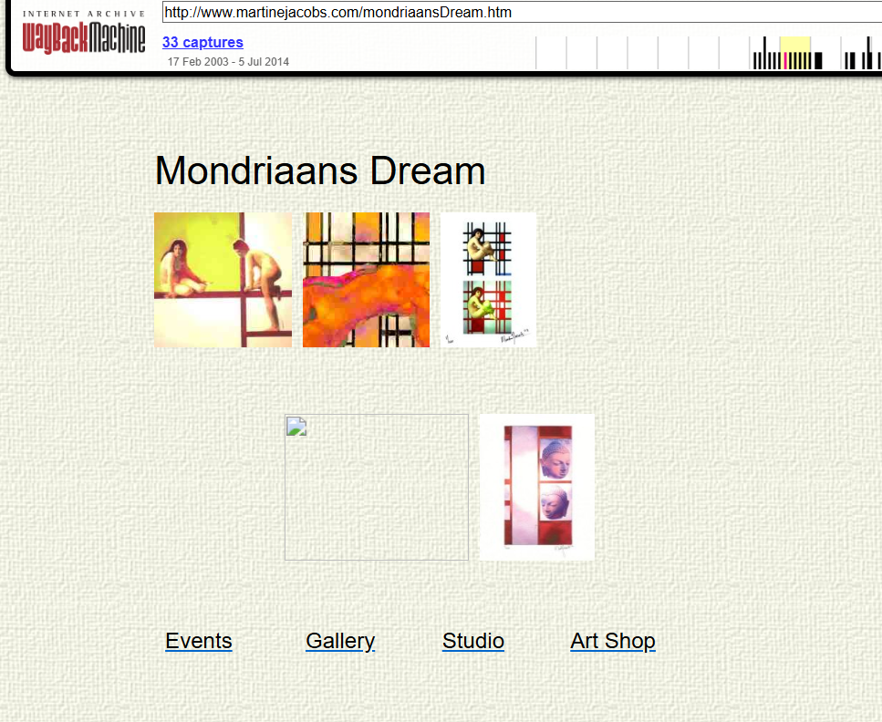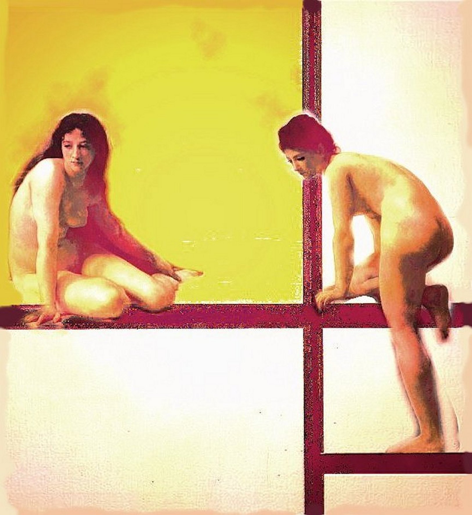 Artist: Martine Jacobs Medium: Digital collage and manipulation using Adobe and Paint Shop Pro on a first-generation Intel Pentium II computer Theme: Feminine duality, erotic geometry, Mondrian as metaphor