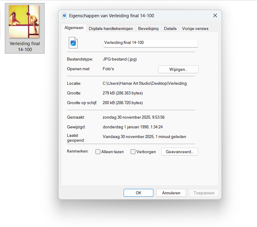 Verleiding is a striking digital composition created by Martine Jacobs in 1998 — a time when digital art was still emerging from its infancy. Using early-generation software and hardware, Martine crafted a sensual tableau of two nude women suspended within a rigid Mondrian-inspired frame. The figures, rendered with emotional realism, appear both exposed and contained — their bodies caught between desire and structure, softness and grid.
