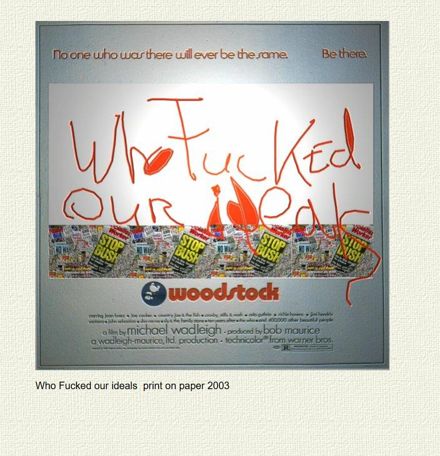 Years later, in 2003, Martine looked back and asked: What remains of our ideals? In response, she created this digital protest piece. Using the iconic LP cover of the Woodstock film — once a symbol of hope — she overlaid it with raw graffiti: “Who Fucked Our Ideals”. The phrase is scrawled in red, urgent and uneven, like a scream across history.