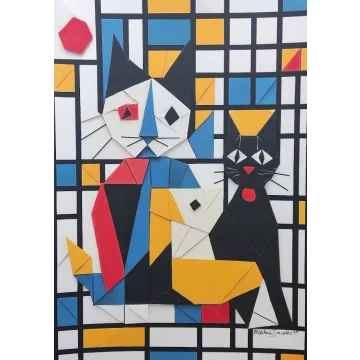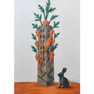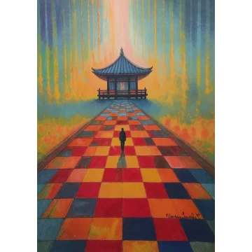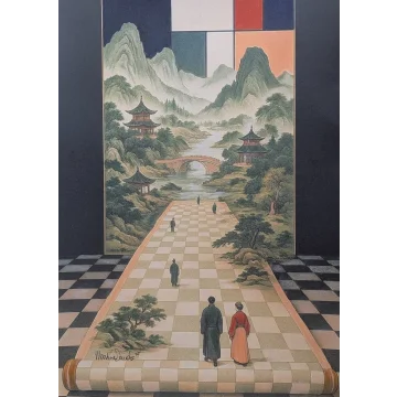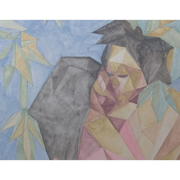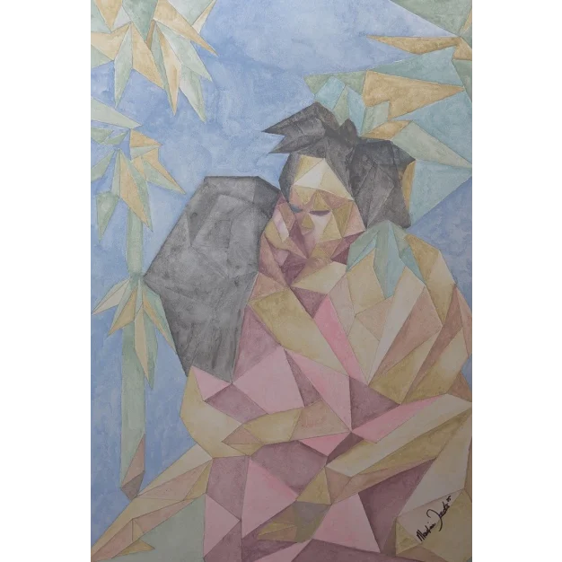 L'œuvre équilibre à la frontière de la figuration et de l'abstraction, la forme humaine et un motif semblable au bambou en haut à gauche étant construits à partir de plis et de facettes semblables à l'origami. La palette est douce et terreuse, avec beaucoup de rose, de beige et de teintes vertes atténuées sur un fond bleu clair. L'ensemble dégage une atmosphère de calme intime et de harmonie structurée.