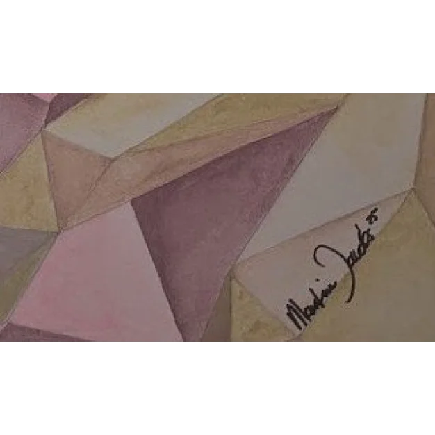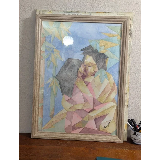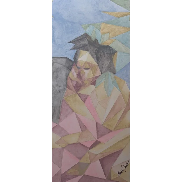 Une aquarelle abstraite de Martine Jacobs représentant une figure en étreinte, entièrement construite à partir de plans géométriques.
