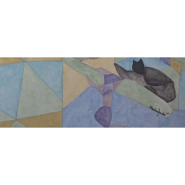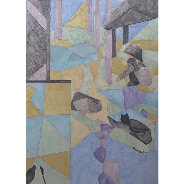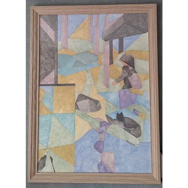 Gli elementi figurativi sono stati integrati in modo astratto nella composizione e mostrano una figura seduta, parzialmente coperta, e un gatto in primo piano. Le aree angolari danno al paesaggio o all'architettura una sensazione di prospettiva spezzata e di ricordo nostalgico. La tecnica è delicata e trasparente, tipica dell'acquerello. incl. certificato