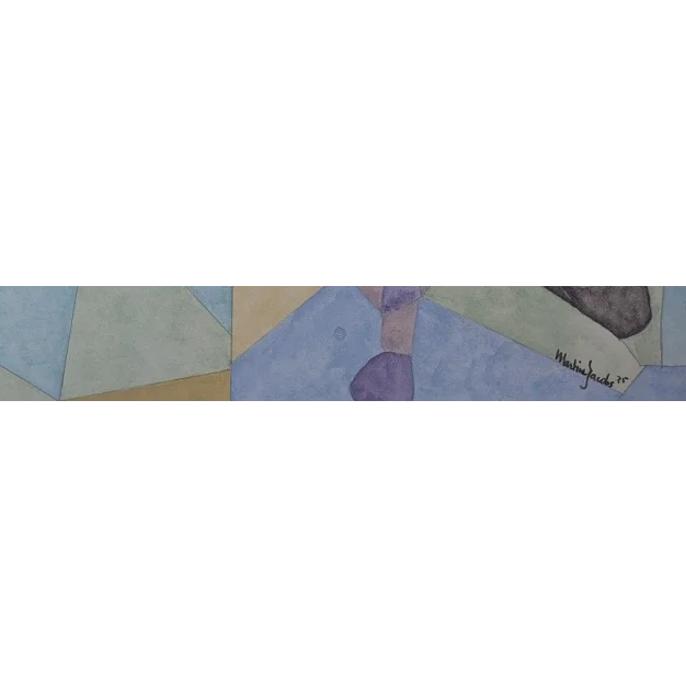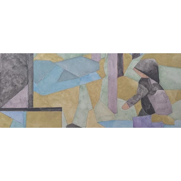 Un acquerello astratto intitolato 'Frammenti di un Ricordo'. L'opera si caratterizza per una composizione geometrica, simile a un mosaico, composta da aree in tonalità morbide e attenuate di blu, viola, verde e ocra.
