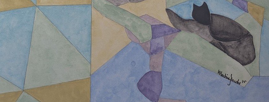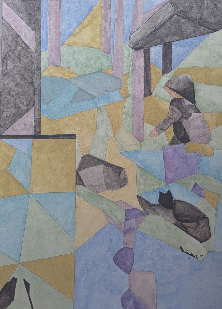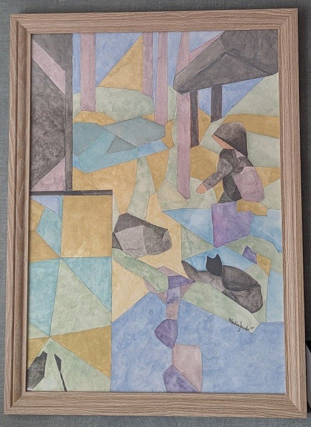 Gli elementi figurativi sono stati integrati in modo astratto nella composizione e mostrano una figura seduta, parzialmente coperta, e un gatto in primo piano. Le aree angolari danno al paesaggio o all'architettura una sensazione di prospettiva spezzata e di ricordo nostalgico. La tecnica è delicata e trasparente, tipica dell'acquerello. incl. certificato