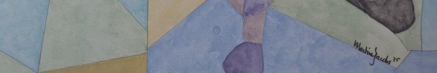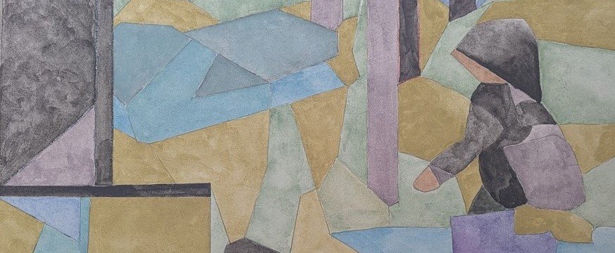Un acquerello astratto intitolato 'Frammenti di un Ricordo'. L'opera si caratterizza per una composizione geometrica, simile a un mosaico, composta da aree in tonalità morbide e attenuate di blu, viola, verde e ocra.