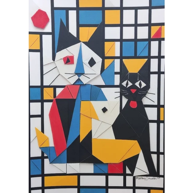 "In quest'opera, volevo far scontrare il mondo rigoroso e razionale della geometria con l'energia giocosa e bizzarra dei gatti. Le linee nere e i colori primari sono un cenno a Mondrian, ma dove lui mirava alla pura astrazione, io riporto la vita nella griglia — con occhi che guardano, nasi che annusano e forme che miagolano.