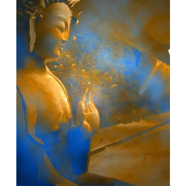 Eenzame Boeddha is een digitaal samengesteld kunstwerk dat in 1998 is gemaakt met Paint Shop Pro op een Pentium II-systeem. Een gestileerde Boeddha-figuur zit in meditatieve stilte, met gesloten ogen, één hand omhoog in een zachte mudra. De achtergrond straalt in blauwe en oranje tinten — een chromatische aura die zowel innerlijke vrede als emotionele intensiteit oproept. De figuur lijkt geïsoleerd, stralend en contemplatief, zwevend in een digitale ruimte die zowel heilig als melancholisch aanvoelt.