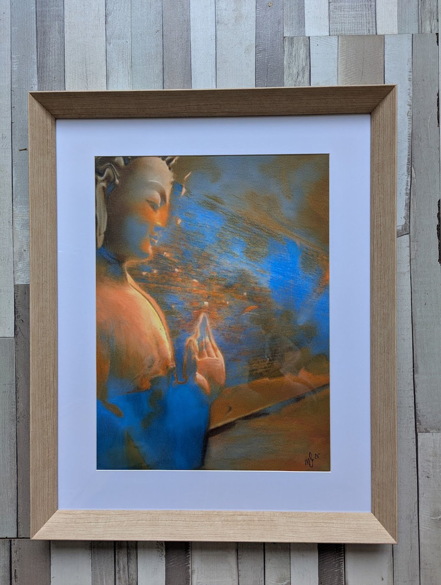 Dit stuk behoort tot de Spirituele Signaalwerken en Emotionele Surrealwerken van Martine Jacobs, waar spirituele iconen worden weergegeven als eenzame zenders van kalmte, weerstand en reflectie. Eenzame Boeddha is niet alleen een meditatiebeeld — het is een digitaal relikwie van emotionele uithoudingsvermogen, gemaakt in een pre-platformtijdperk waarin spirituele kunst pixel voor pixel werd gecodeerd. Het werk spreekt over de spanning tussen sereniteit en isolatie, aanwezigheid en afwezigheid, toewijding en verlangen.
