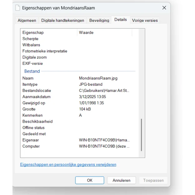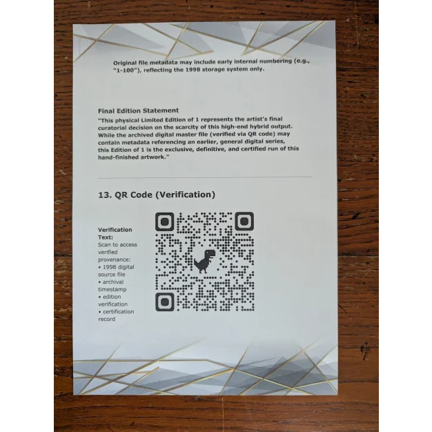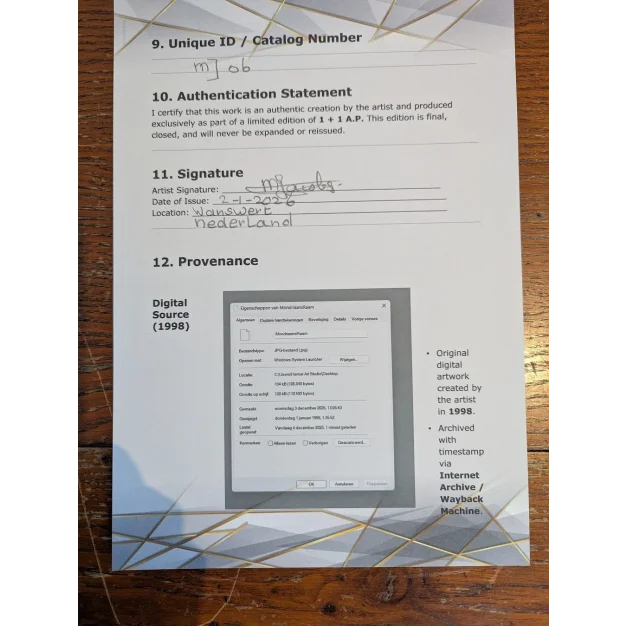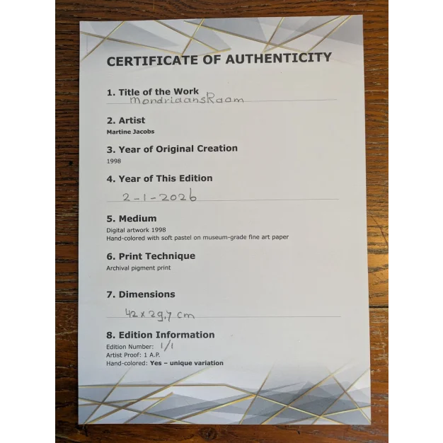 Mondriaans Venster (1998): De allereerste 1/1 NFT uit het archief, uniek gepaard met een uniek handgekleurde fysieke meesterwerk.
