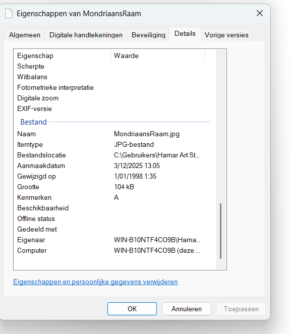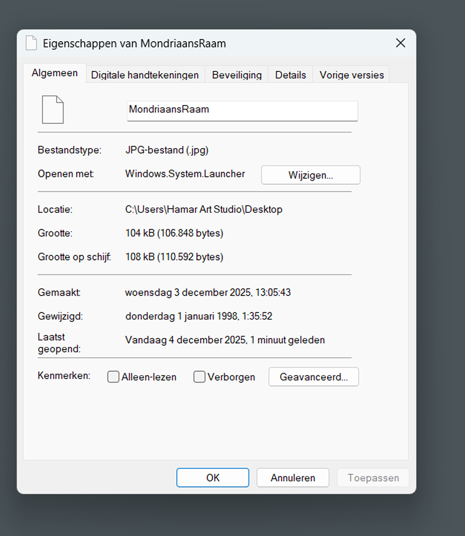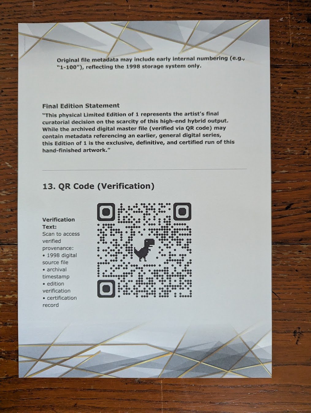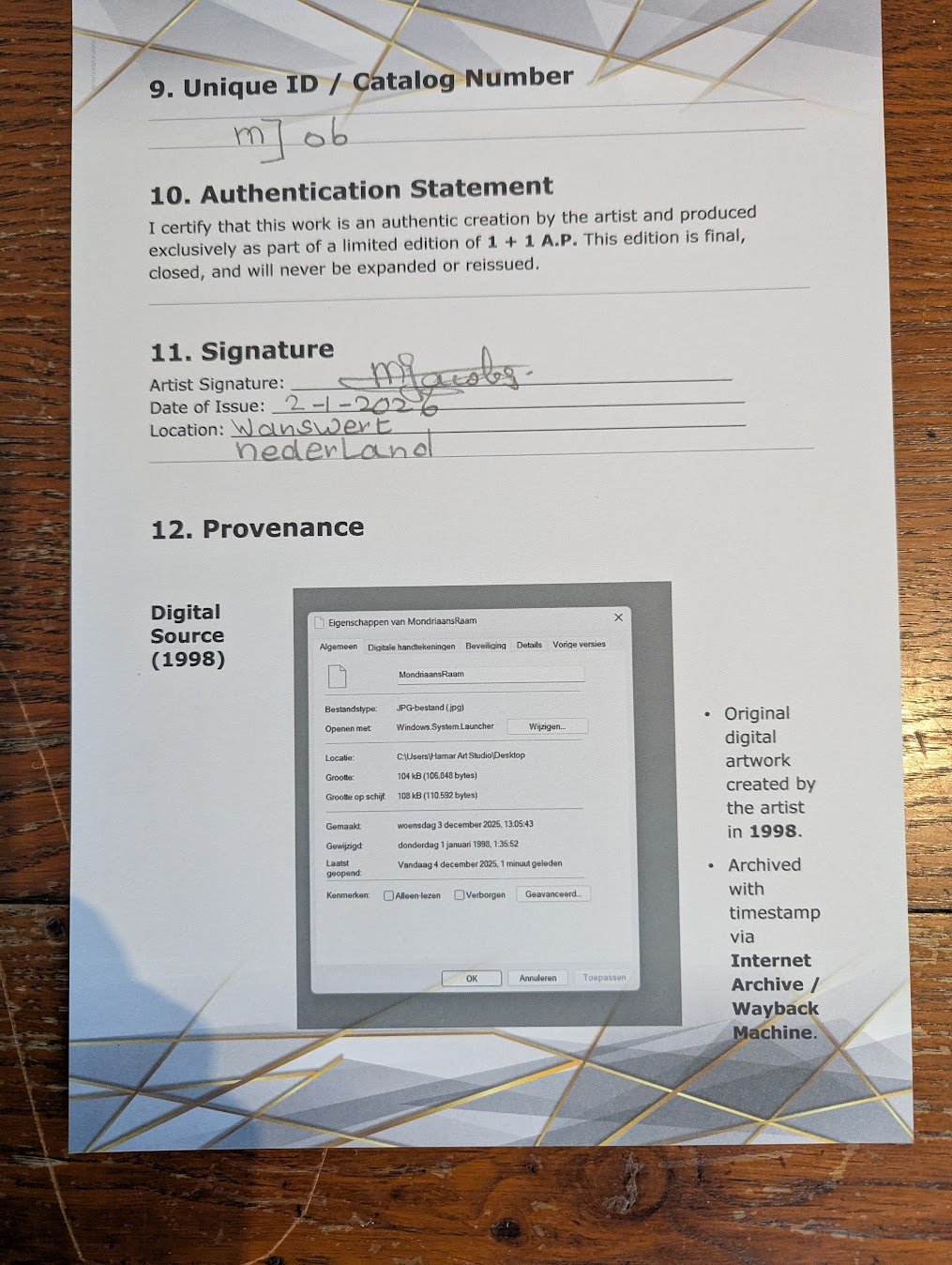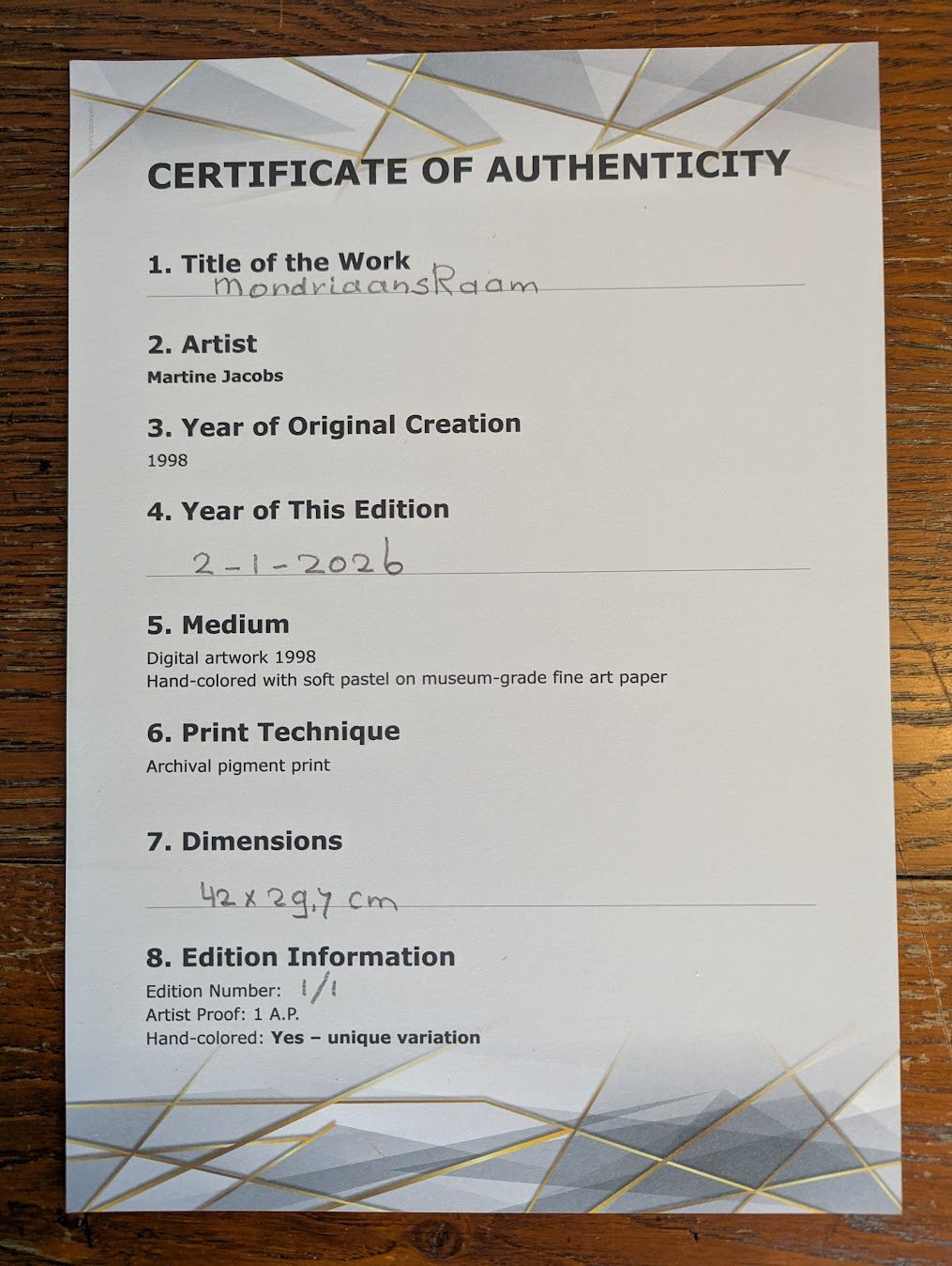 Mondriaans Venster (1998): De allereerste 1/1 NFT uit het archief, uniek gepaard met een uniek handgekleurde fysieke meesterwerk.